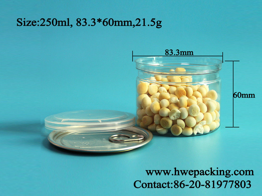 To są plastikowe puszki PET nr 307, które po napełnieniu przekąsek w puszkach, aluminiowa pokrywka EOE (pokrywka z łatwym otwieraniem końcówek) wymaga maszyny uszczelniającej do uszczelnienia pokrywy, w razie potrzeby dostarczamy maszynę do uszczelniania zapałek dla klientów.Oferujemy plastikowe puszki z uchwytem, które mogą się utrzymaćProdukty o pojemności 250 ml w puszkach, a puszki z uchwytem są szczelne i w 100% hermetyczne.